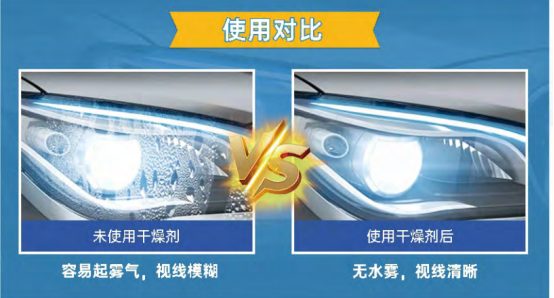 1. 防霧防露:干燥劑吸濕,防止車燈內部濕氣凝結成霧或水滴,確保燈光清晰。