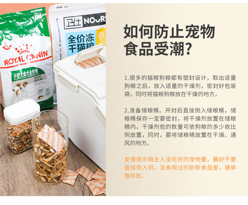 狗糧干燥劑是一種可以吸收狗糧中的水分的物質,可以將潮濕的狗糧變干,從而降低狗糧的濕度,防止狗糧變質、霉變,延長狗糧的保質期。同時,狗糧干燥劑還可以減少狗糧中的細菌和霉菌的生長,從而保證狗糧的衛生安全。