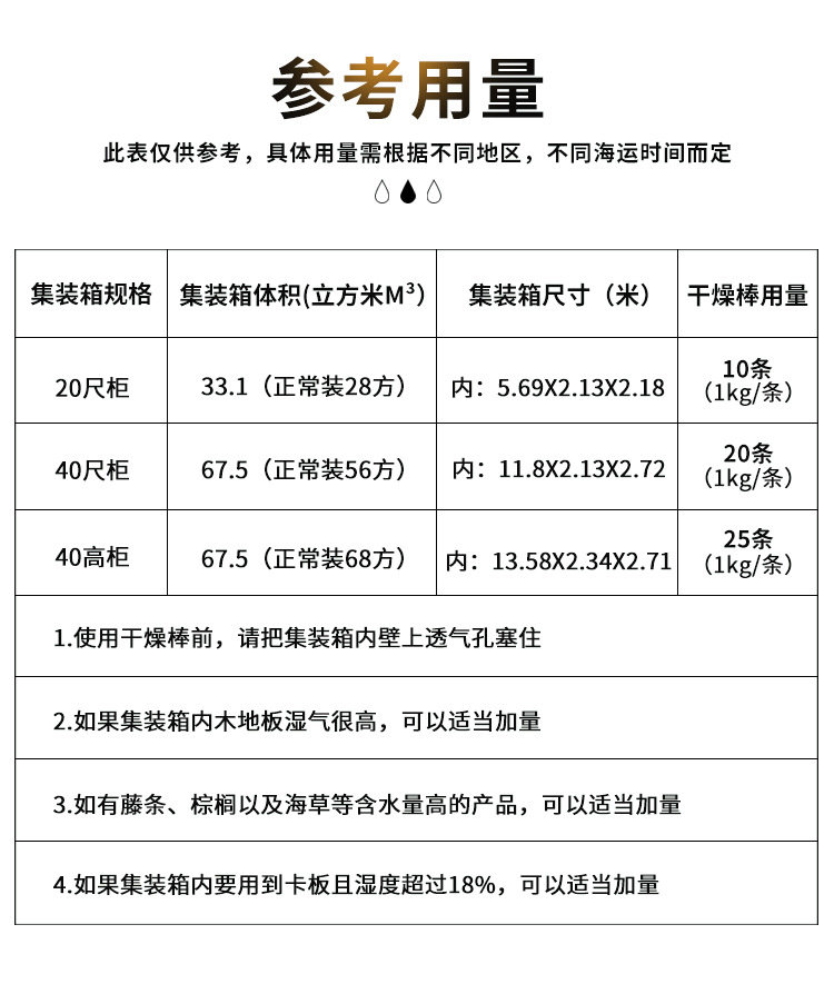 使用集裝箱干燥劑,提前做好防潮保護措施。目的是從空氣中吸收潮濕,以減少進入集裝箱內濕氣的總量。集裝箱干燥劑的使用量取決于貨物種類,航程長短,還有可接受的損害程度。一般一個20尺柜建議用6條以上1kg集裝箱干燥劑,把集裝箱干燥劑懸掛在集裝箱內壁上的掛環上。 如果集裝箱內的包裝物料含水率高,如果木箱,托盤等,應該加大集裝箱干燥劑的用量。貴重貨物更應該做好防護,加大用量。也可以額外平鋪些集裝箱干燥劑在紙箱上。