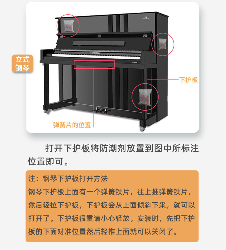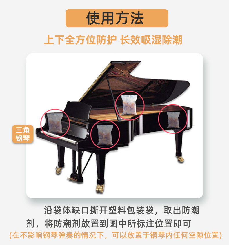 3、數量選擇:根據鋼琴的大小和濕度情況,選擇適量的干燥劑。一般來說,鋼琴的大小越大,所需要的干燥劑數量也越多。濕度較為嚴重的地區,可能需要放多2-3包干燥劑。長期處于濕度環境較高的朋友建議您一次購買六包,保證長期的循環使用周期。