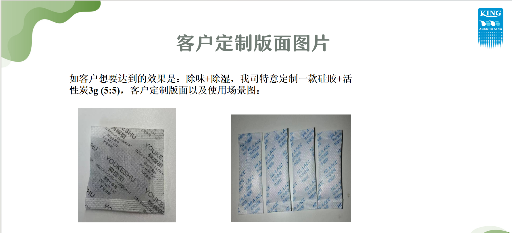 客戶情況:2021年底接到浙江一個客戶反饋,他們生產服裝已有10年了,但是最近有小部分客戶投訴;說他們的產品出現包裝袋子里面有濕氣、霧水的情況。經過電話溝通了解到他們之前一直用的是硅膠1克干燥劑,但是在2021年底這期間就接到很多的客戶反應:收到的服裝好多都出現發霉了的情況,但是客戶一直沒有重視。