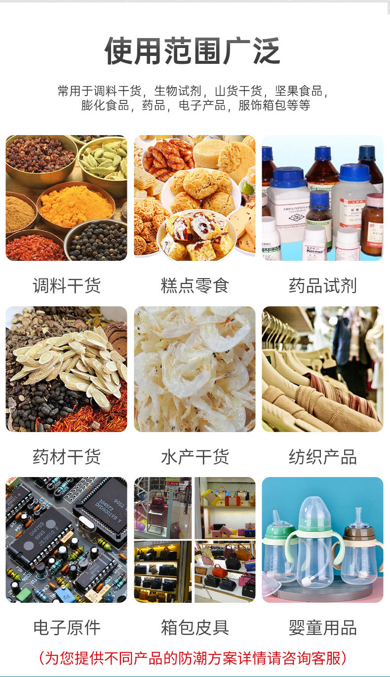 多種規格,以適用于不同行業及不同的應用場景。蒙脫石干燥劑廣泛應用于堅果防潮、餅干防霉、大米防潮、豆類防潮、干貨防潮、電子產品防潮、衣服防潮、書本防潮、皮具防霉、包裝、安防、燈具、電子電器、金屬制品、運動器材、精密儀器、電控設備、軍工航材等領域。