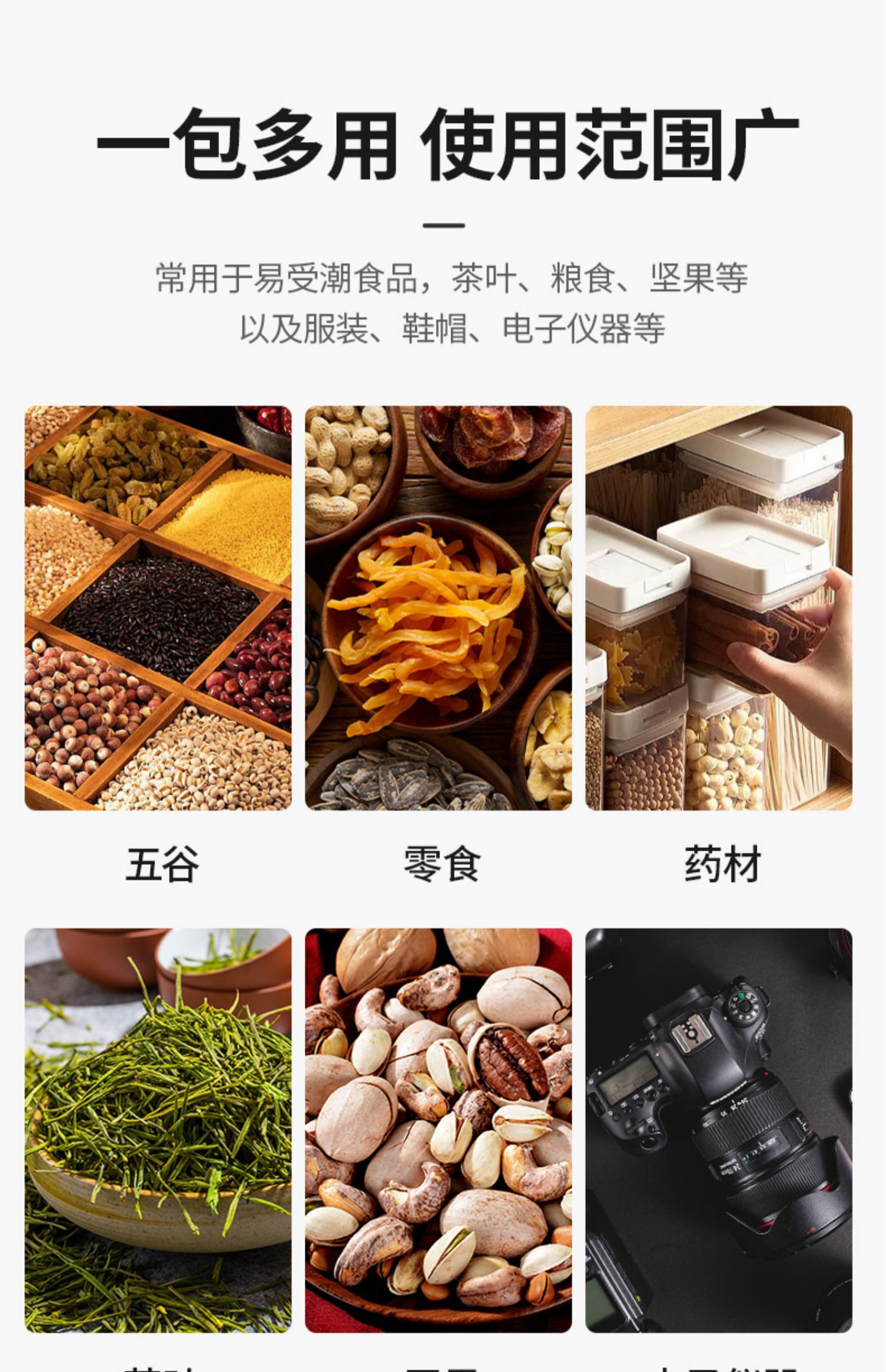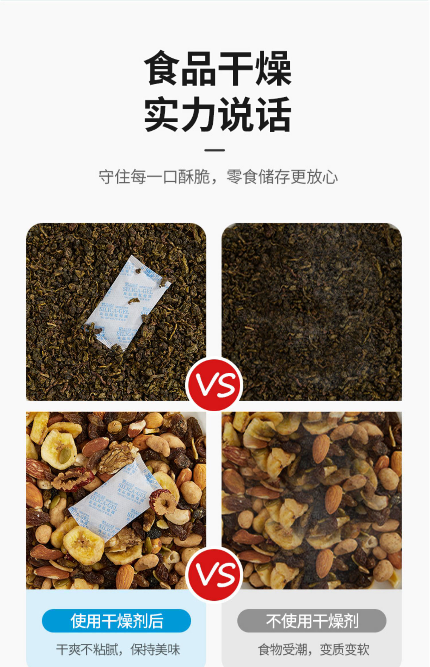 本產品具有無毒、無味、無腐蝕、無污染及價格低廉等優點。食品級的硅膠干燥劑常用于堅果、炒貨、糖果、餅干、雪餅、蜜餞果脯、茶葉、膨化食品、魚干魚絲、海苔、農產干貨、茶葉、保健食品等含水量較低的食品。