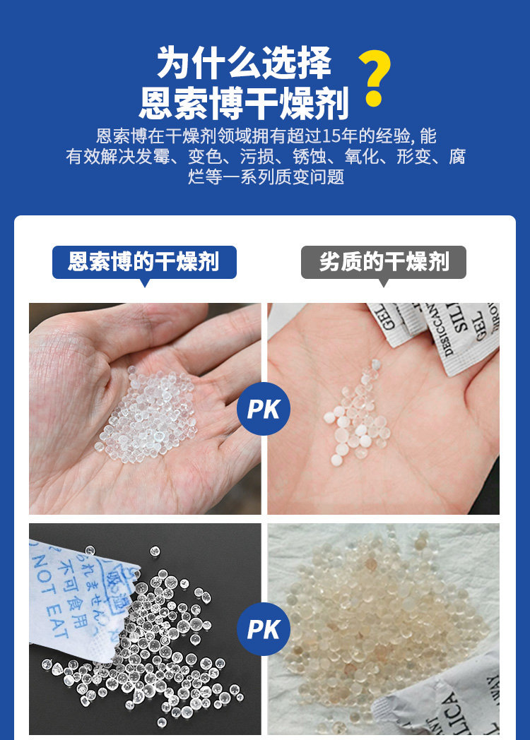 深圳恩索博的硅膠干燥劑真的是棒,首先,它采用了優質的硅膠材料,不但環保安全,而且吸濕能力非常強大!而且它還具有很長的使用壽命,有效保持食品的干燥度!